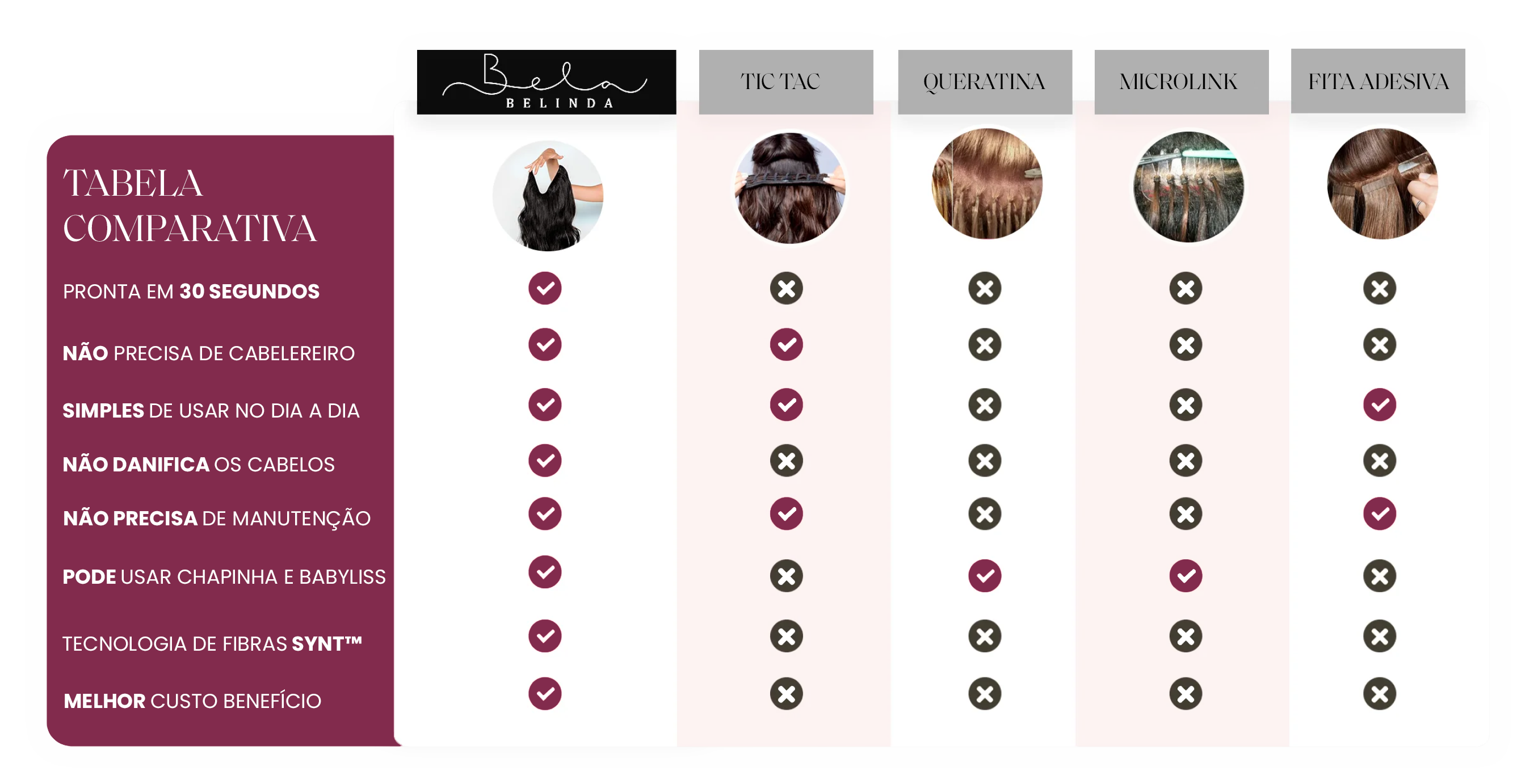 Além de ser risco zero e não causar danos para seus cabelos, os Apliques da BelaBelinda não causam danos ao seu Bolso.